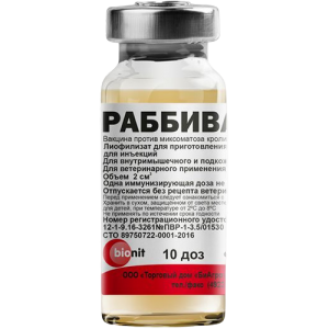 Раббивак-V против вирусной геморрагической болезни кроликов. Вызывает формирование иммунного ответа у кроликов к вирусной геморрагической болезни через 5-9 суток после однократного введения. Напряженность иммунитета у животных составляет 12 месяцев. Лечебными свойствами вакцина не обладает.