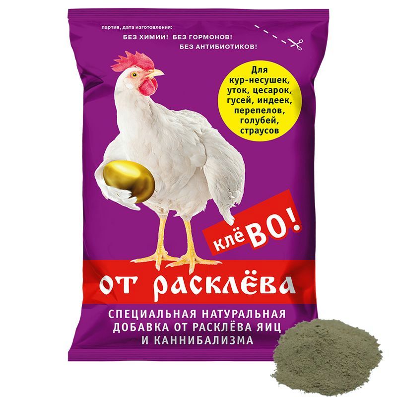 Клёво от расклева — специальная натуральная добавка от расклева яиц и каннибализма для кур-несушек, уток, цесарок, гусей, индеек, перепелов, голубей, страусов. Специальная кормовая добавка создана в помощь хозяевам для быстрого решения проблемы расклева и профилактики проявлений агрессии у всех видов домашней птицы. Особенно необходима в стрессовых условиях, при скученном содержании и отсутствии выгула. Добавка отличается накопительным эффектом: чем дольше вы ее применяете, тем лучше результат. С кормовой добавкой получите: