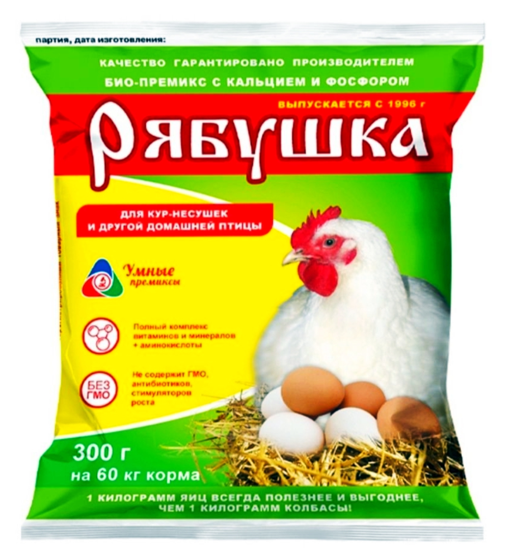 Витаминно-минеральная кормовая добавка в виде премикса для сельскохозяйственной птицы с кальцием и фосфором с 9-недельного возраста для производства комбикормов и кормосмесей сельскохозяйственной птицы. Премикс Рябушка способствует нормализации обмена веществ, предупреждению заболеваний, вызванных дефицитом кальция и фосфора, витаминов, повышению устойчивости организма к болезням, способствует повышению продуктивности, сохранности птицы и эффективности использования корма, улучшению пищевой и технической ценности мяса и яиц. В премиксе учтены все потребности растущей и взрослой птицы.