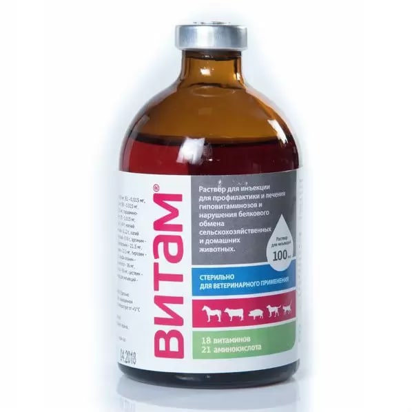 Витаминно-аминокислотный комплекс «Витам», благодаря наличию сбалансированного количества витаминов, аминокислот, микроэлементов и глюкозы, компенсирует дефицит этих биологически активных веществ в организме животных, возникающий при стрессах, профилактических прививках и дегельминтизации, после перенесенных заболеваний, способствует нормализации обмена веществ у животных.