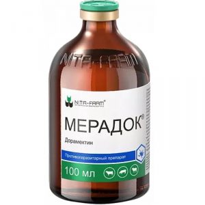 Мерадок относится к противопаразитарным лекарственным препаратам системного действия нового поколения макроциклических лактонов. Обладает широким спектром инсектицидного, нематодоцидного и акарицидного действия; активен против нематод желудочно-кишечного тракта, легких, подкожной клетчатки, личинок оводов, а также вшей, саркоптоидных и иксодовых клещей.