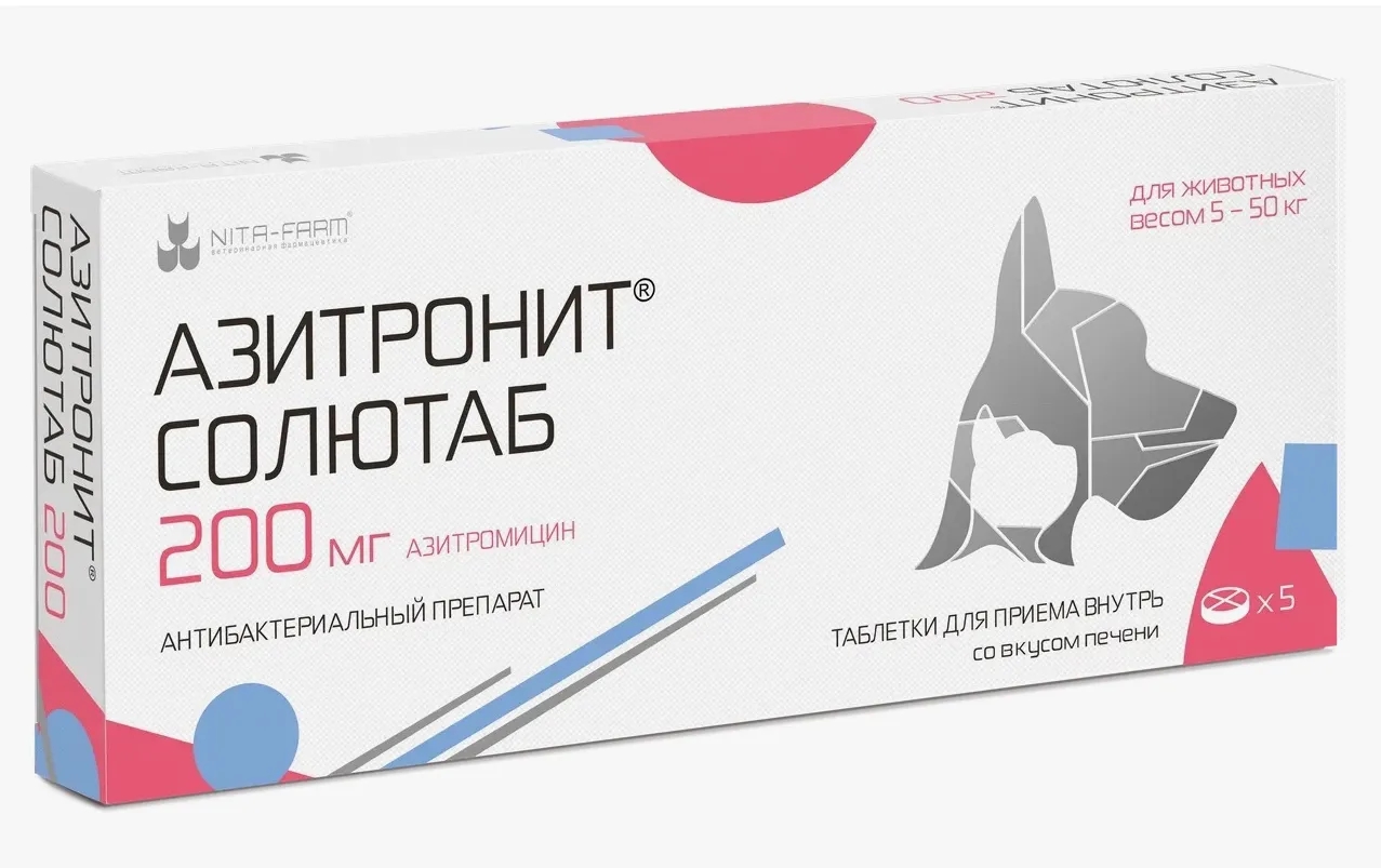 Азитронит Солютаб применяют кошкам и собакам для лечения бактериальных инфекций органов дыхания, мочеполовой системы, инфекций кожи и мягких тканей, а также инфекций, вызываемых микроорганизмами, чувствительными к азитромицину.