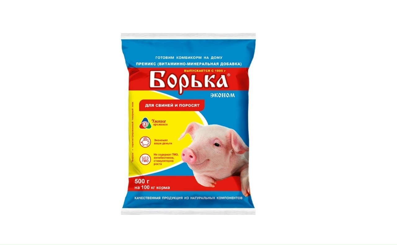 Премикс Борька Эконом — кормовая добавка предназначенная для обогащения рационов свиней всех возрастов витаминами и микроэлементами. Премикс Борька способствует нормализации обмена веществ, предупреждению заболеваний, вызванных дефицитом минеральных веществ и витаминов, повышению устойчивости организма к болезням, способствует повышению продуктивности, сохранности животных и эффективности использования корма, улучшению пищевой и технической ценности мяса. Способствует: