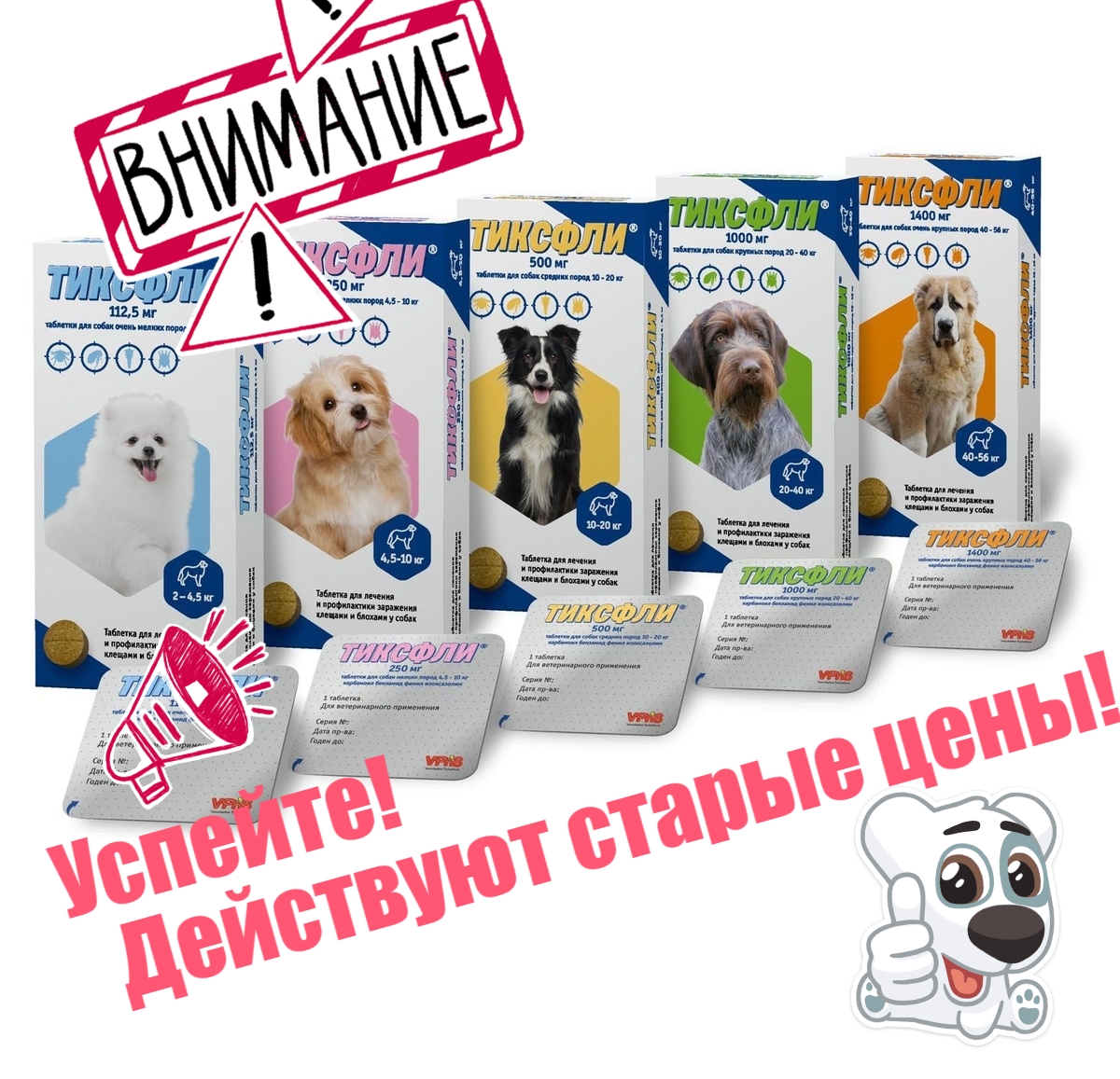 * Тиксфли д/собак весом 4,5- 10 кг (250 мг) таблетки от блох и клещей — 2600 рублей;