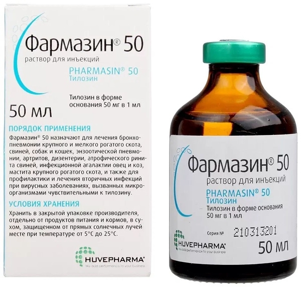 Фармазин 50 — лекарственный препарат, содержащий в качестве активнодействующего вещества антибиотик тилозин в форме основания в органическом растворителе.