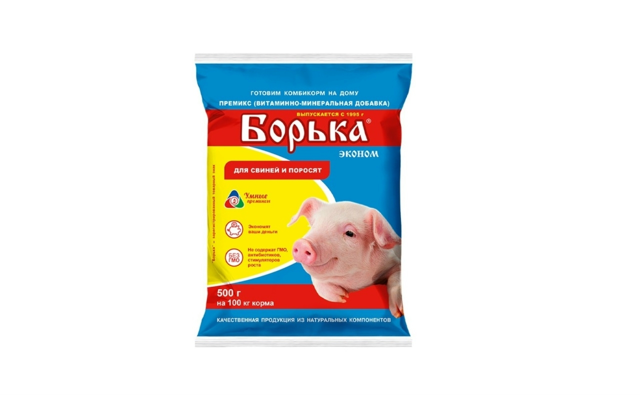 Премикс Борька Эконом — кормовая добавка предназначенная для обогащения рационов свиней всех возрастов витаминами и микроэлементами. Премикс Борька способствует нормализации обмена веществ, предупреждению заболеваний, вызванных дефицитом минеральных веществ и витаминов, повышению устойчивости организма к болезням, способствует повышению продуктивности, сохранности животных и эффективности использования корма, улучшению пищевой и технической ценности мяса. Способствует: